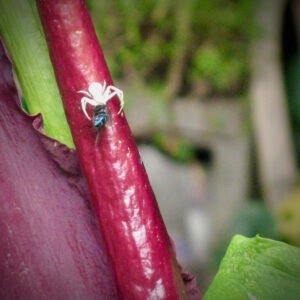 1. A white crab spider likes our Dragon Lily, which has a beautiful flower but a terrible smell, designed to attract bluebottles for pollination.